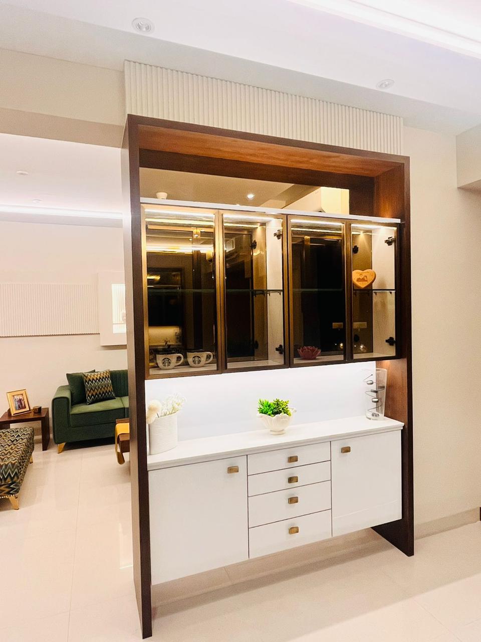 Cove-lit false ceiling, LED strips behind the headboard, recessed spotlights in the display cabinet, and warm pendants in the dining area. Clean and minimal throughout.
