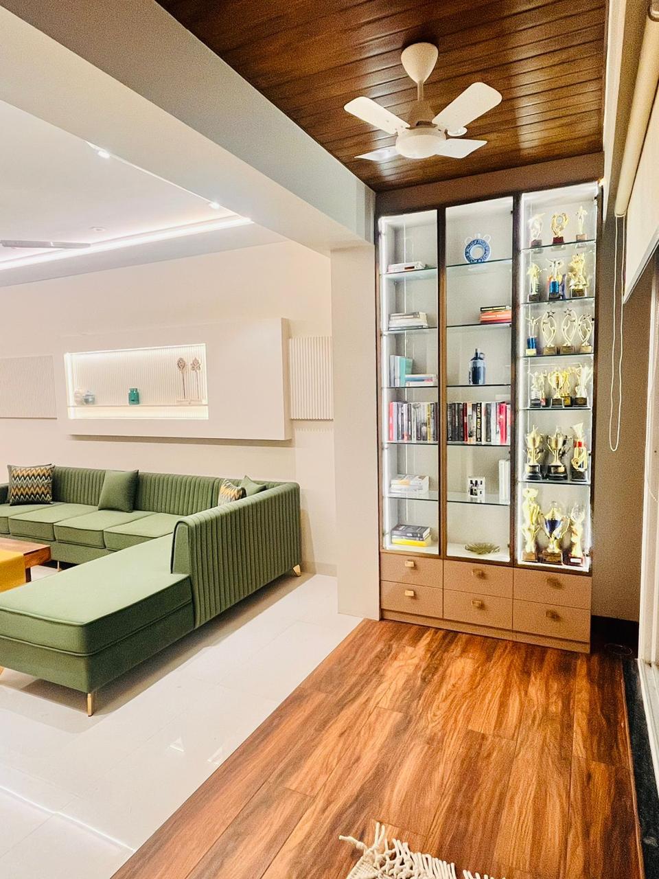 A full-height walnut-framed glass cabinet displays trophies and books. The flooring transitions from white tile to warm wooden planks, creating a distinct zone within the open plan.