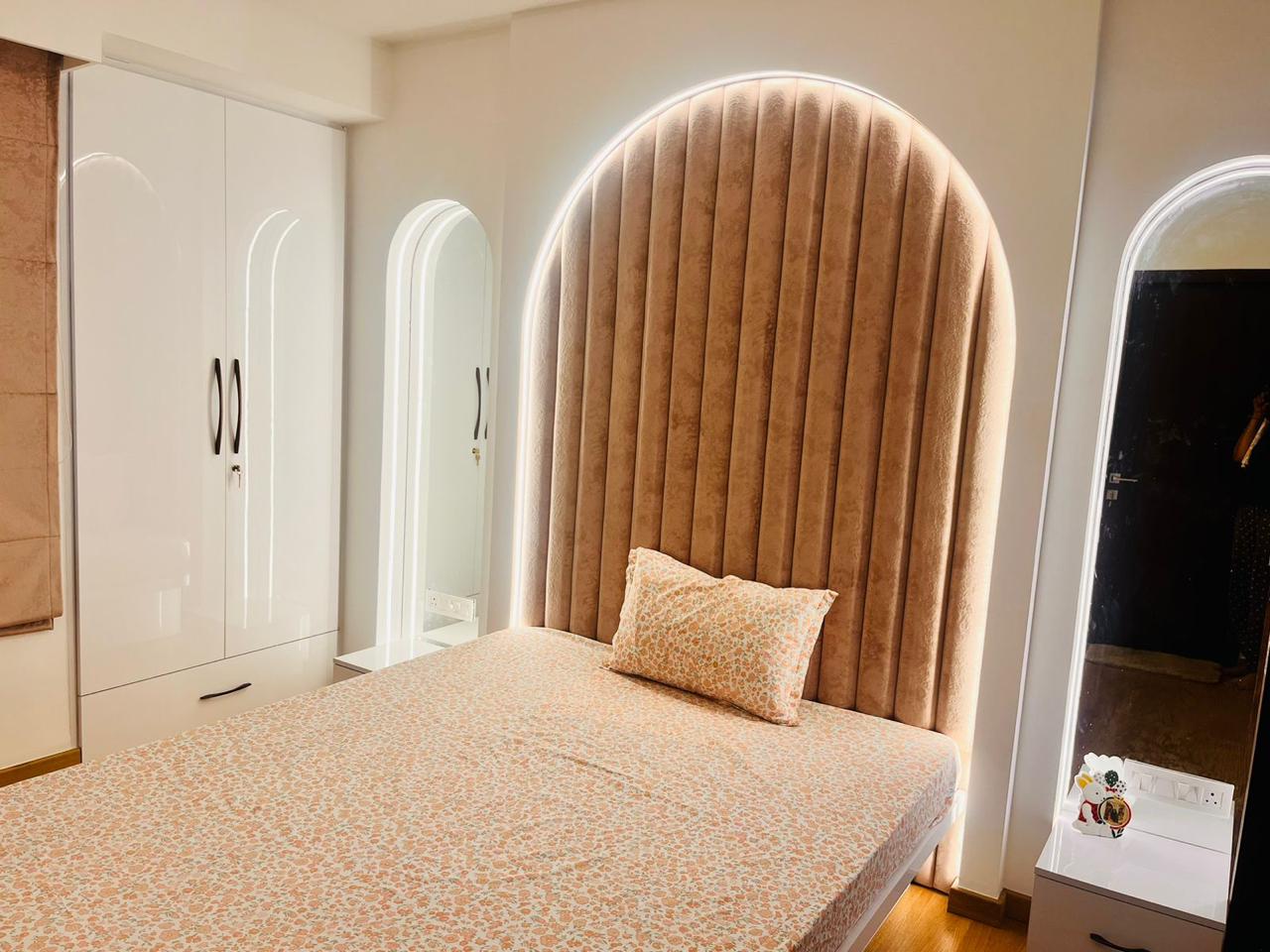 A large arched headboard in blush velvet, backlit with LED strips. White high-gloss wardrobes with arched door details and a full-length mirror keep the room bright and efficient.