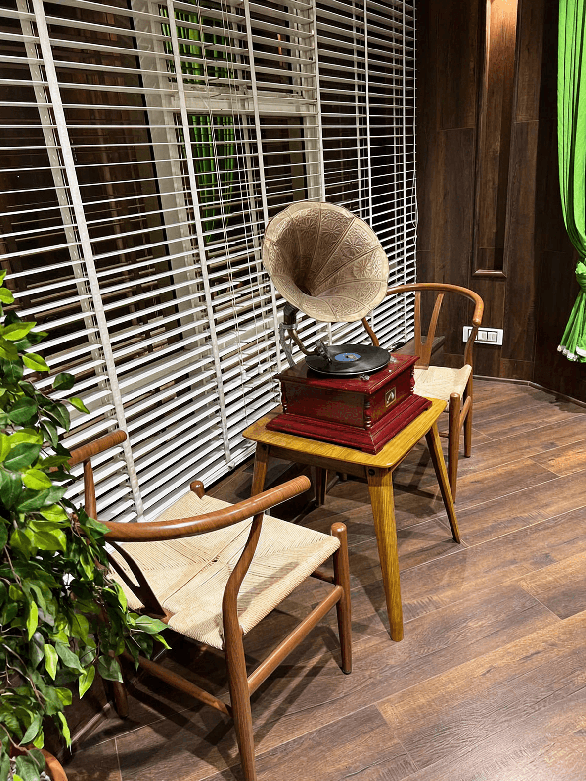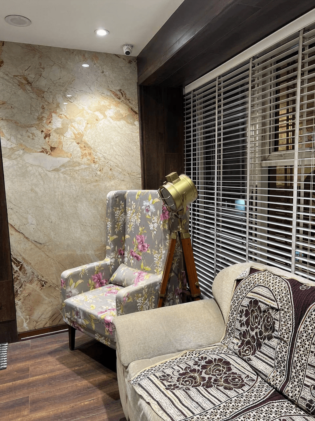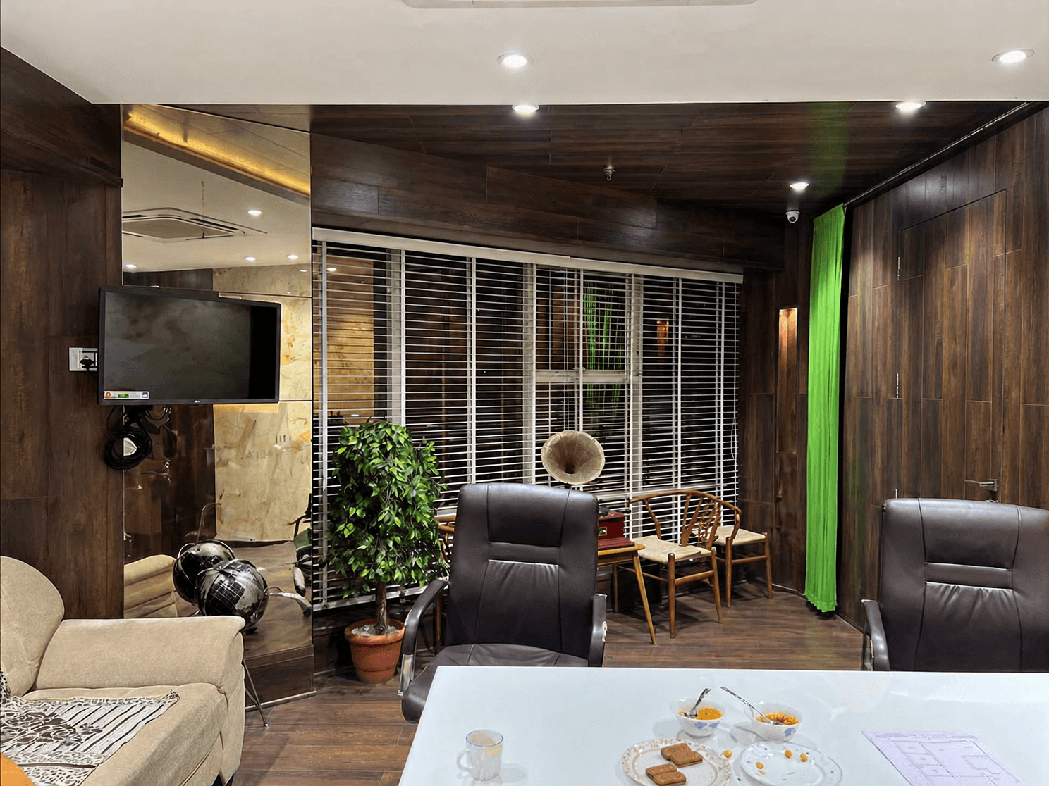 Matte-finish painted walls, wood-grain laminates, premium leather upholstery, and floating glass shelving.