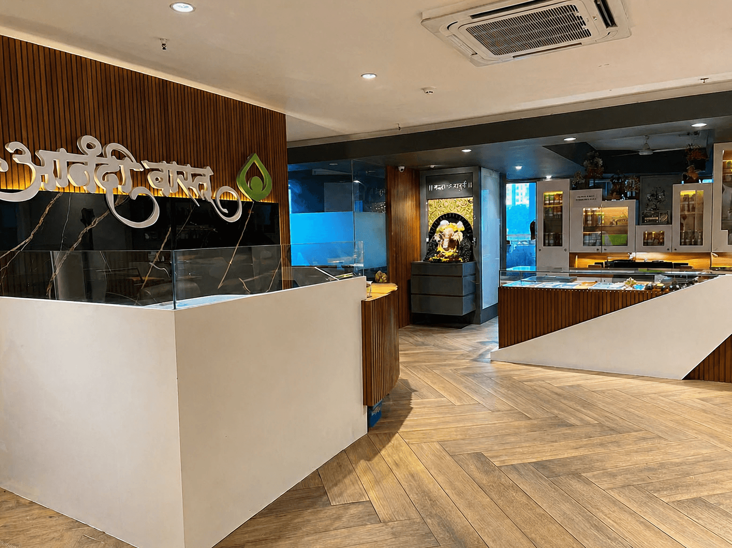 Sleek, handle-less white overhead cabinets provide ample concealed storage, while custom glass shelving elegantly displays personal artifacts and a dedicated spiritual corner.