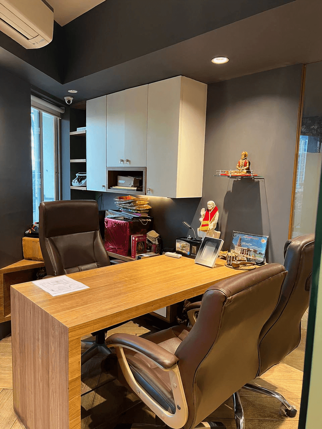 Two comfortable, brown leather guest chairs sit opposite the desk, ensuring a welcoming environment for meetings and consultations.