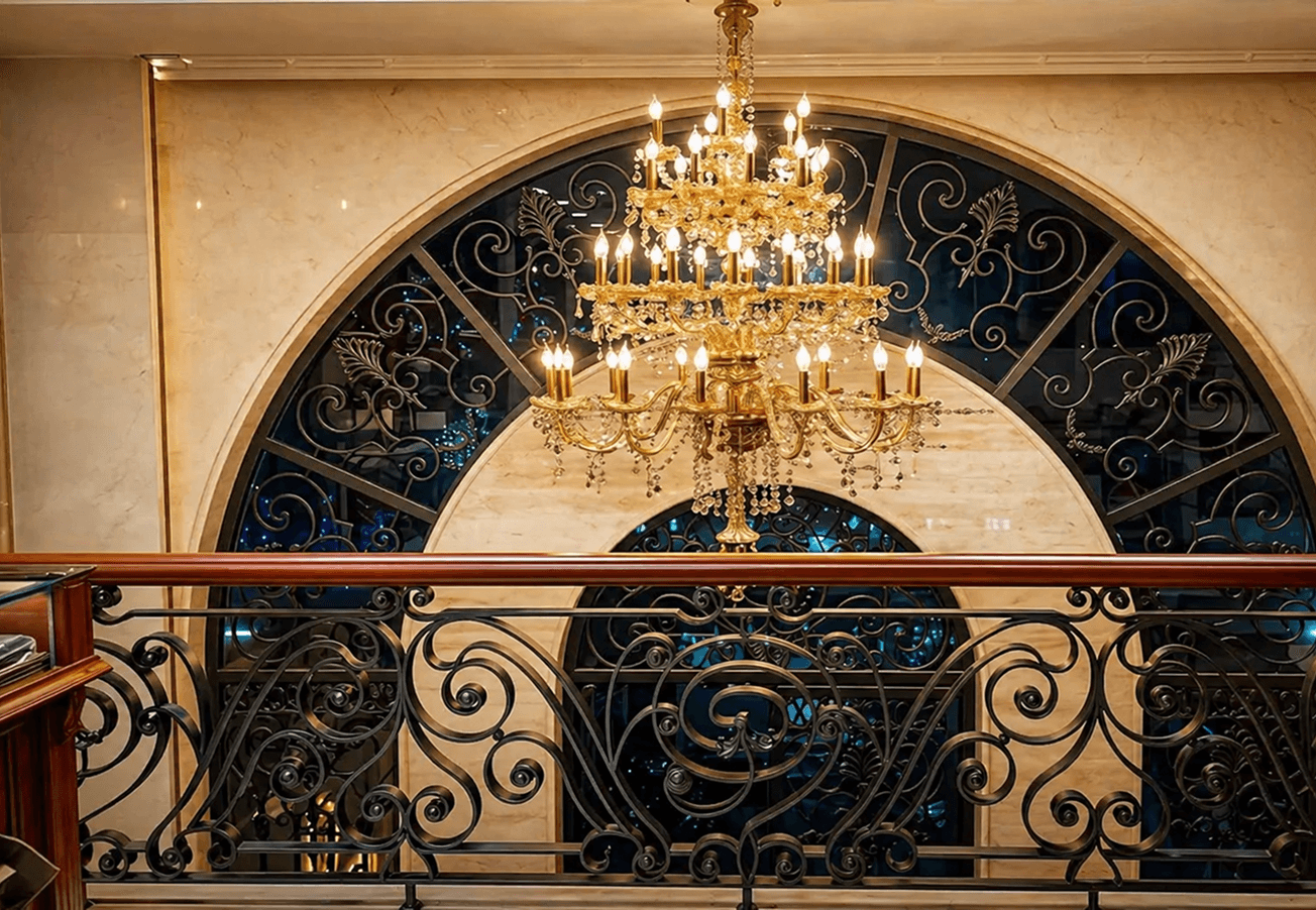 Carved stone facades, wrought-iron detailing, expansive glass panels, and high-gloss interior finishes.