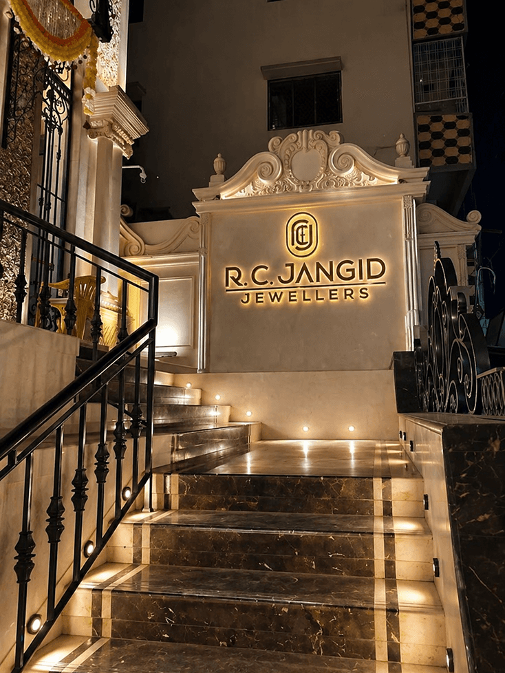 Extensive architectural facade lighting, back-lit logo features, and specialized, high-CRI display lighting designed specifically to make jewellery sparkle.