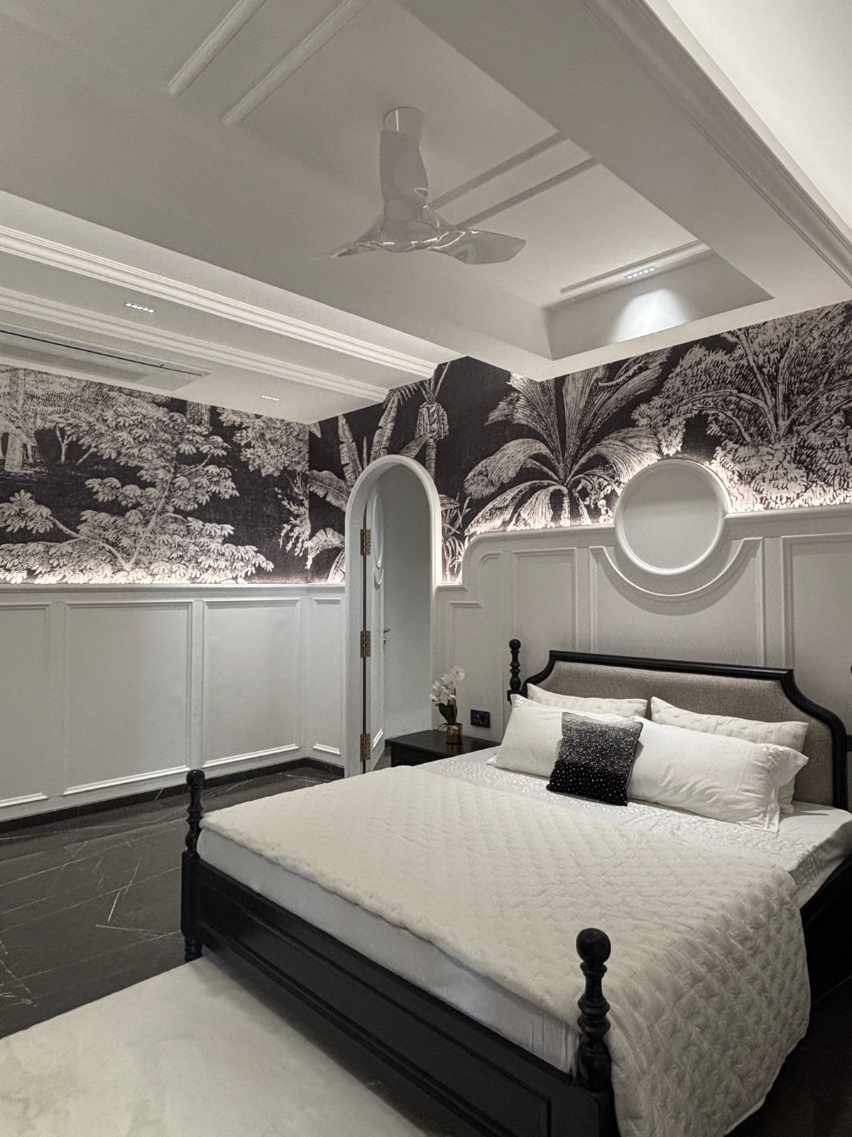 Italian marble with black veining, red genuine leather, crystal chandeliers, dark walnut arched doorways, toile-print wallpaper, white wainscoting, and multi-layer sheer and satin curtains.