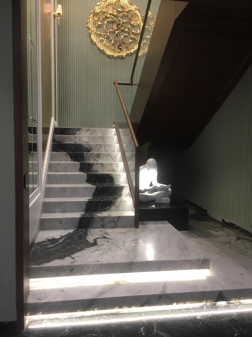Crystal chandeliers in every living area, LED step-lighting on the staircase, a gold filigree pendant at the landing, sconces beside the fireplace, and cove lighting in the master bedroom.