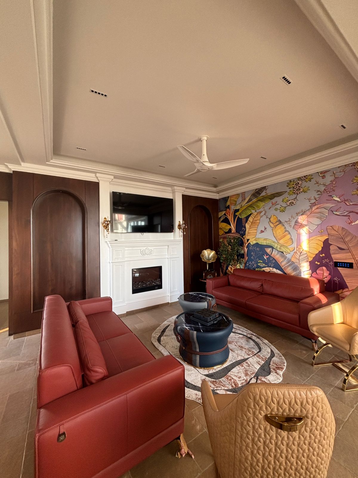 Red Italian leather sofas arranged around a smoked-glass coffee table. A white fireplace mantel beneath a wall-mounted TV, flanked by dark walnut arched doorways. One wall features a dramatic tropical leaf mural in pink, yellow, and purple.