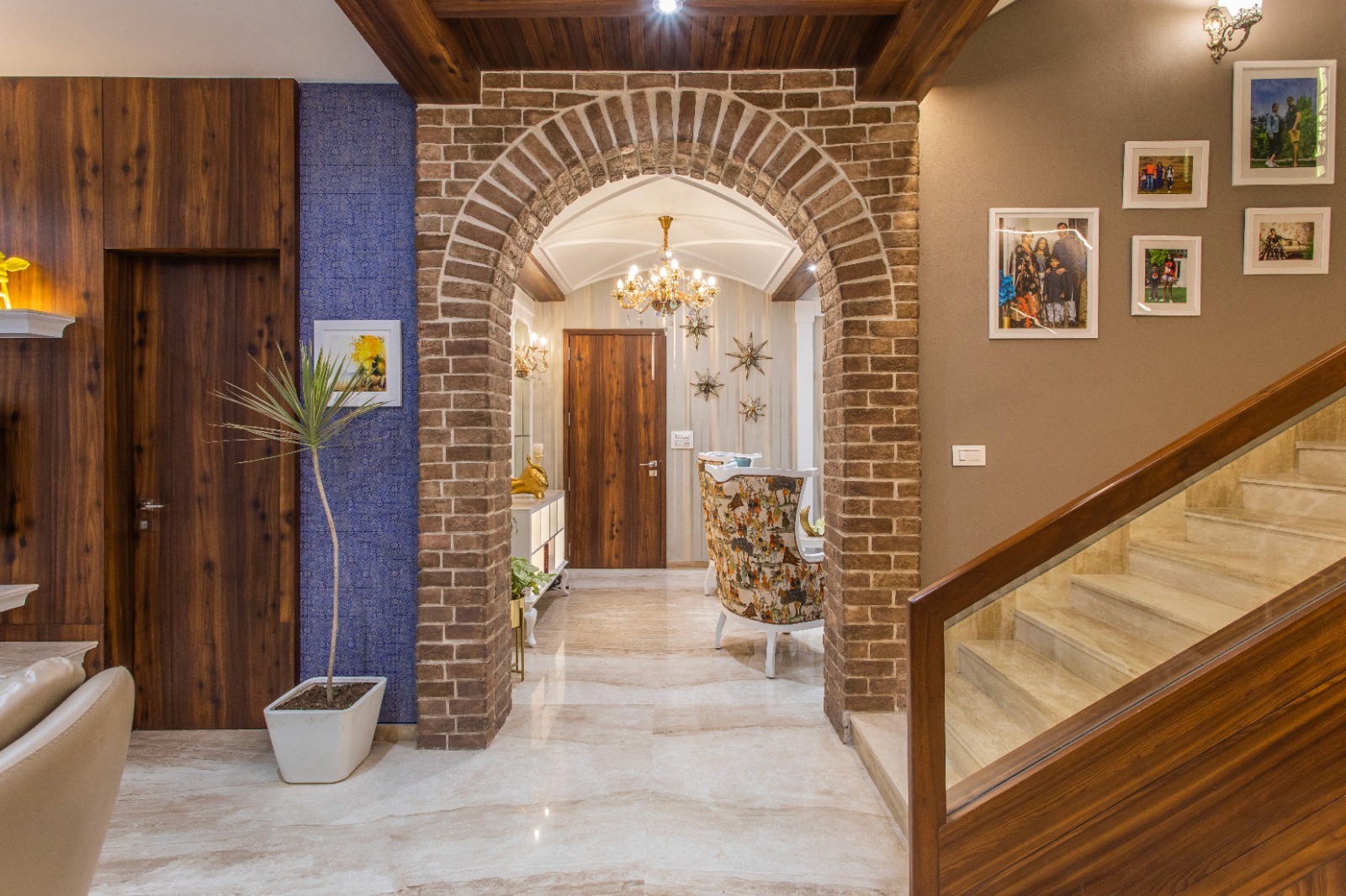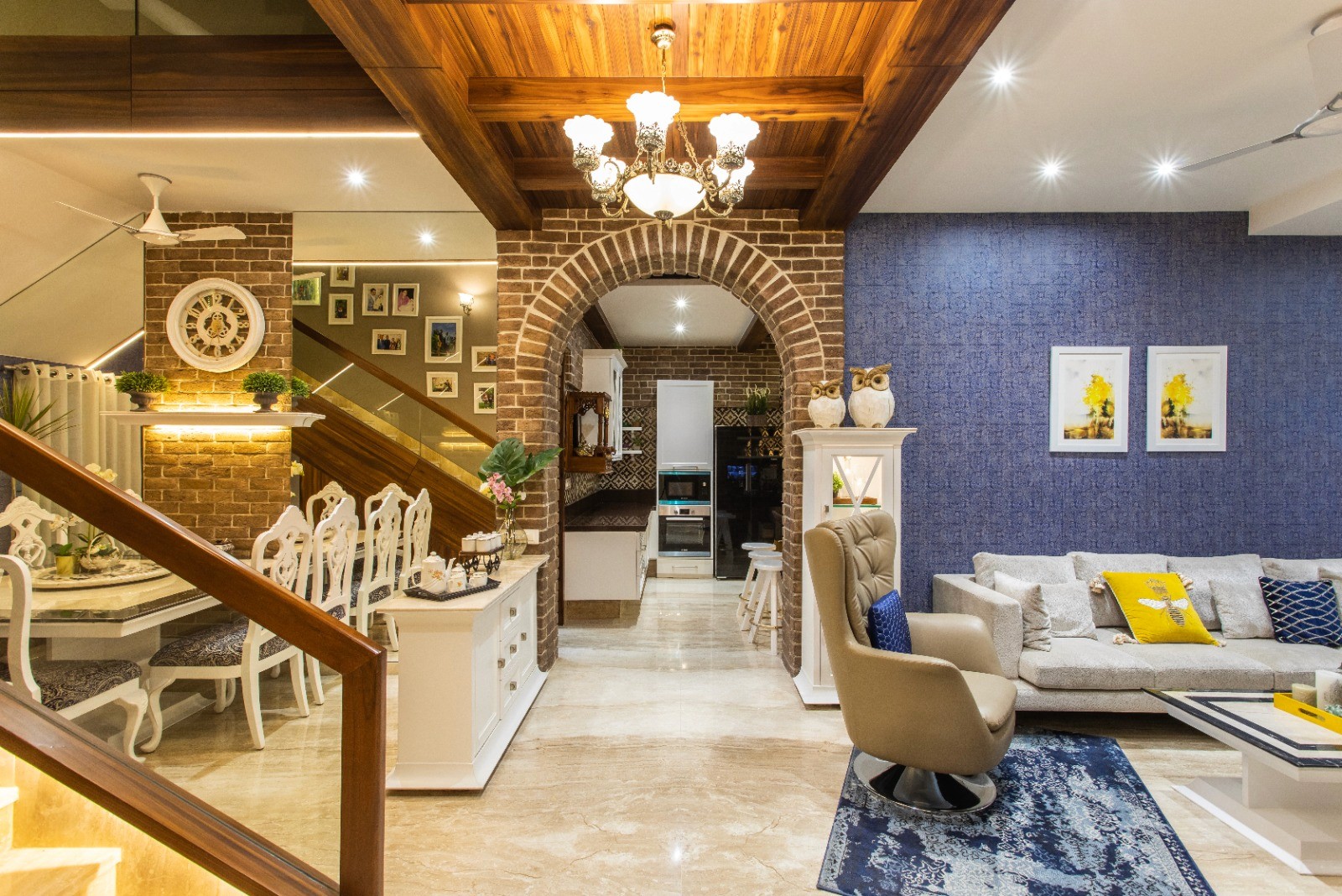 Exposed brick arches, teak wood plank ceiling, Italian marble flooring, carved white-painted furniture, tufted velvet upholstery, and black-and-white geometric kitchen tiles.