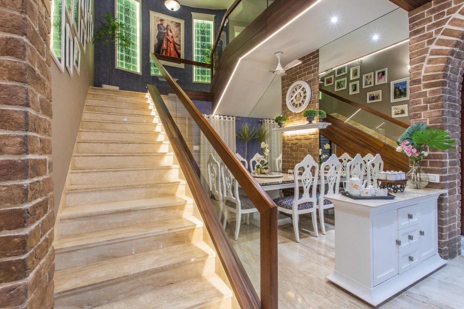 A white French-provincial dining set sits beyond the brick arch, next to a glass staircase railing and a gallery wall of family photos. The kitchen uses black-and-white patterned tiles and a clean white modular setup.