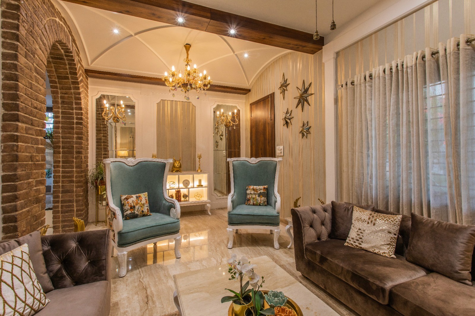 Exposed brick arches and a wooden plank ceiling define the main living area. Teal wingback armchairs with white carved frames sit alongside brown tufted sofas. A gold chandelier, star-shaped wall accents, and a backlit display shelf add detail.