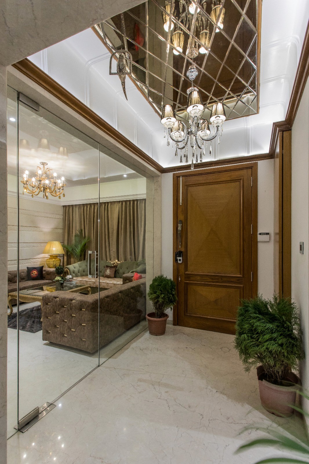 A floating wooden staircase with marble treads and glass railings rises through a double-height atrium. The foyer ceiling is covered in mirrored diamond panels, with a crystal chandelier and potted ferns below.