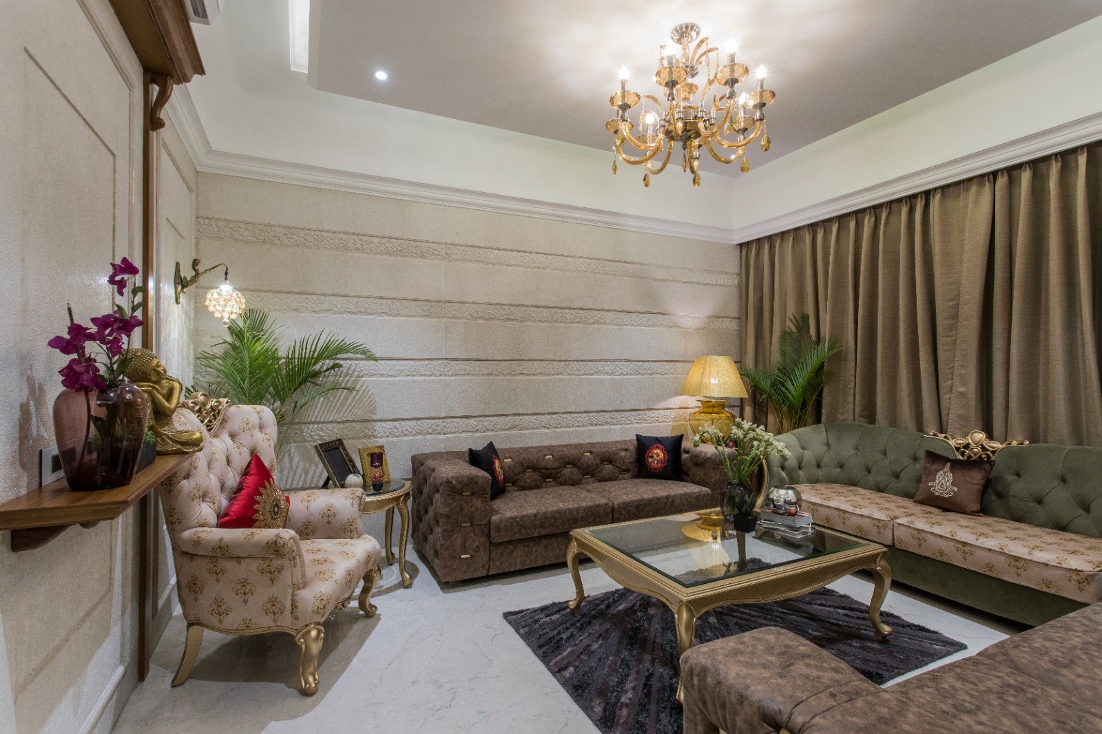 Tufted Chesterfield sofas in brown and olive green sit around a glass centre table with gold legs. Carved armchairs with brocade fabric add warmth, and a golden chandelier ties the room together. Textured wall panels and olive drapes frame the space.