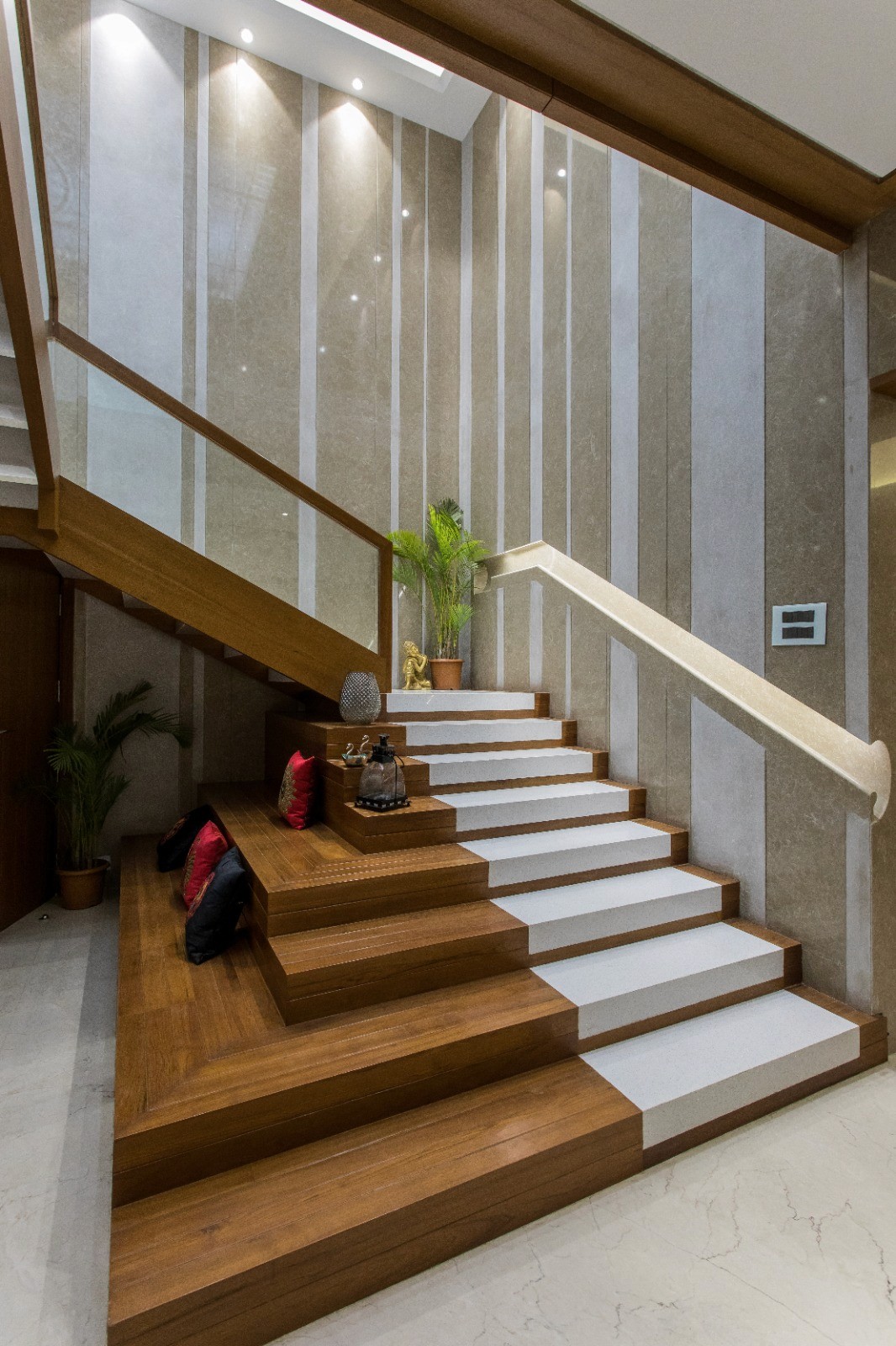Italian marble flooring, solid teak on the staircase and ceiling beams, glass railings, tufted velvet and brocade upholstery, mirrored ceiling panels, and textured stone-finish wall panels.